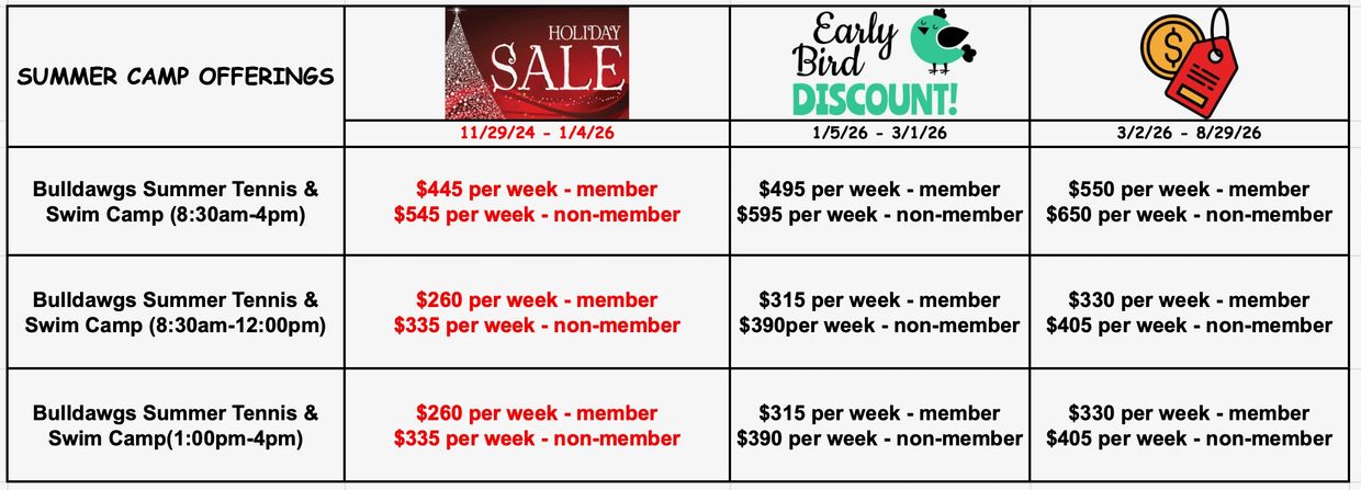 Designed for recreational players ages 12 and up, from beginners to intermediate skill levels. Campers are grouped by ability to ensure fun, focused instruction and skill development. Each day includes engaging drills, point play, and match-style games, with exciting Friday competitions to wrap up the week.