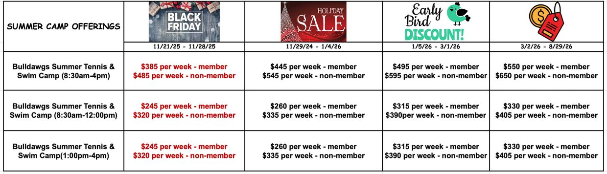 Join us for an unforgettable summer experience at our BULLDAWGS Summer Tennis & Swim Camp, where campers can enjoy a dynamic blend of tennis, pickleball, and indoor swimming. Our camp offers top-notch instruction, fun-filled activities, and an inspiring environment that encourages growth and new friendships.